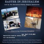 The Diocese of the Armenian Church of Canada, is organizing a pilgrimage to Jerusalem, which will be led by His Eminence Bishop Bagrat Galstanian, Primate of the Diocese. The journey is scheduled to take place from April 9-23, 2012. For all those interested in joining this pilgrimage, we urge you to please contact the Diocese at 514-276-9479 extension 6, immediately, to reserve your place, as space is limited. The deadline for registration is, January 20, 2012.