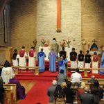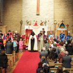 After the words of greeting, a procession including the new members of the Junior ACYOC, the deacons and the acolytes, with the singing of the hymn of “Ourakh ler sourp yegeghetzi” (Rejoice Holy Church) approached the altar bringing with them two “Khatchvars” (Church flag banner) and the flags of the Republic of Armenia and Nagorno Karabagh. His Eminence Bishop Bagrat anointed the “khatchvars” and blessed the flags, asking God to protect our fatherland Armenia and the free Republic of Artsakh.