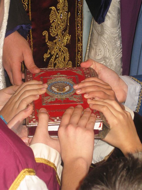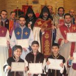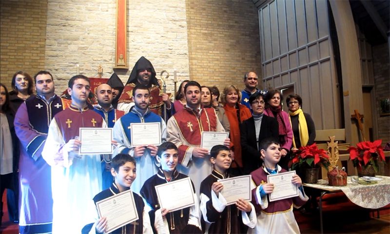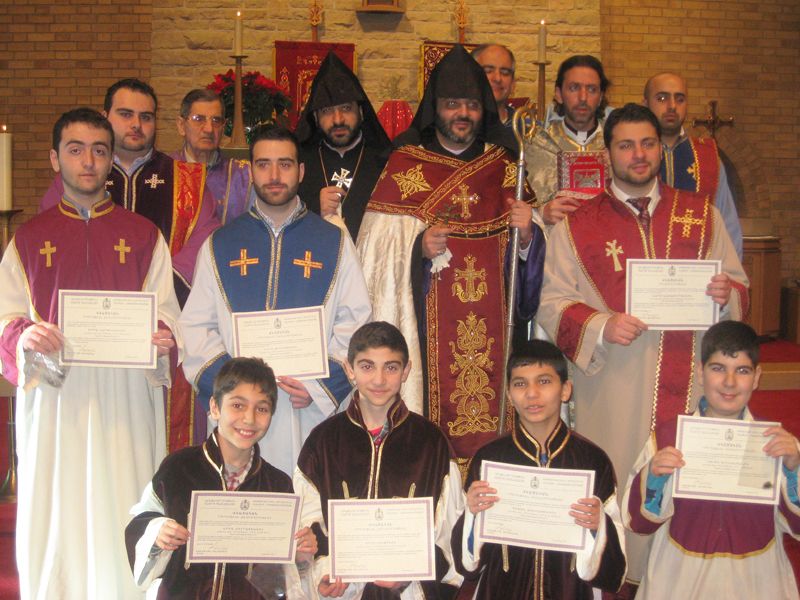 His Eminence Bishop Bagrat Galstanian, Primate joined St. Vartan Parish of Mississauga on Sunday, January 22, 2012, for another milestone in the life of the Armenian Church in Mississauga. Six young men, who have grown up in our parish, were ordained to become Acolytes (Tebirs) of the Church. Throughout this past year, they completed a concise course of study that included learning the Holy Badarak and the other services of the Armenian Church, and how to serve on the holy altar, during Liturgy. Hratch Melkon, Vigen Mouradian, Aris Mouradian, Sevan Doumanian, Yeghia Sarkis and Garo Torossian were ordained to the rank of tebir. Saro Khatchadourian was ordained Ouraragir.