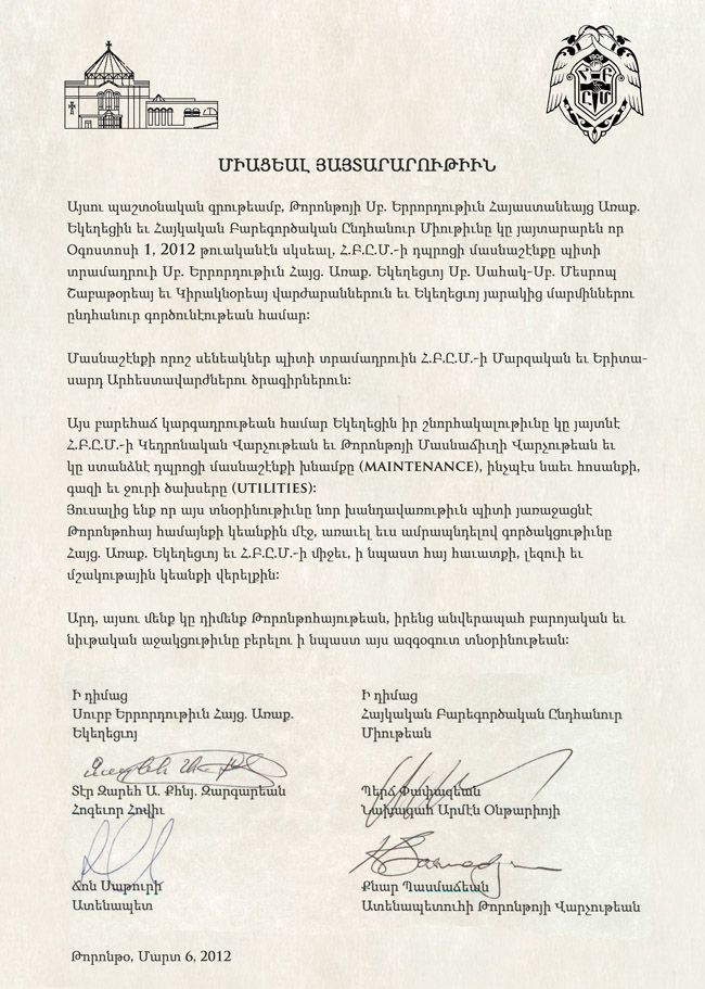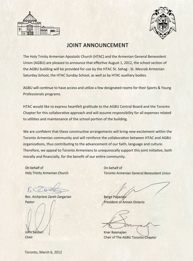 HomeDiocesan newsJoint Announcement by HTAC and AGBU Toronto Joint Announcement by HTAC and AGBU Toronto Share Tweet Pin it Previous Post Feast of St Vartan the Warrior and his Companions Next Post Bishop Bagrat Galstanian's Pastoral visit to St. Vartan Church of British Columbia Related Posts Diocesan news Canada Day Celebration Diocesan news Consecration of the altar icon dedicated to Saint Mary in Laval Diocesan news The 39th Annual Diocesan Assembly