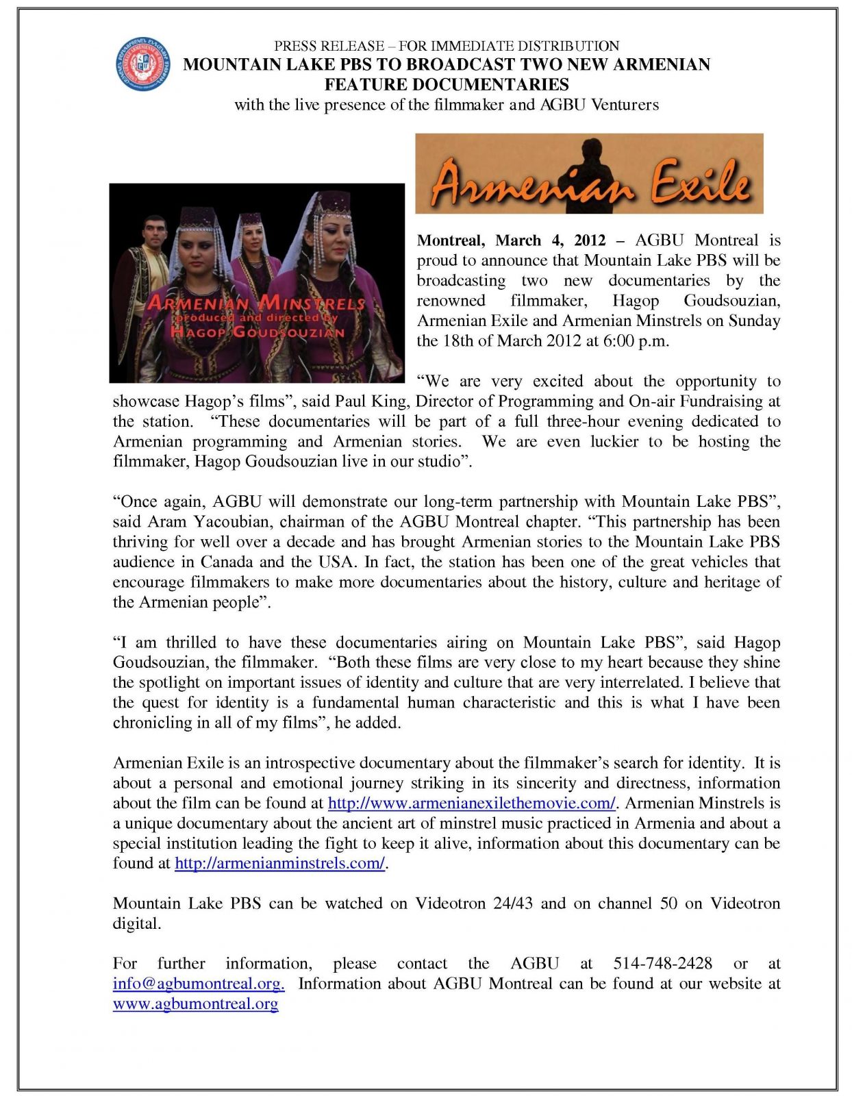 HomeDiocesan news"Armenian Exile " and "Armenian Minstrels" on March 18, 2012 on Mountain Lake PBS. “Armenian Exile ” and “Armenian Minstrels” on March 18, 2012 on Mountain Lake PBS. Share Tweet Pin it Previous Post Prayer of the Week Next Post ACYOC JR. Ski Trip Related Posts Diocesan news Canada Day Celebration Diocesan news Consecration of the altar icon dedicated to Saint Mary in Laval Diocesan news The 39th Annual Diocesan Assembly