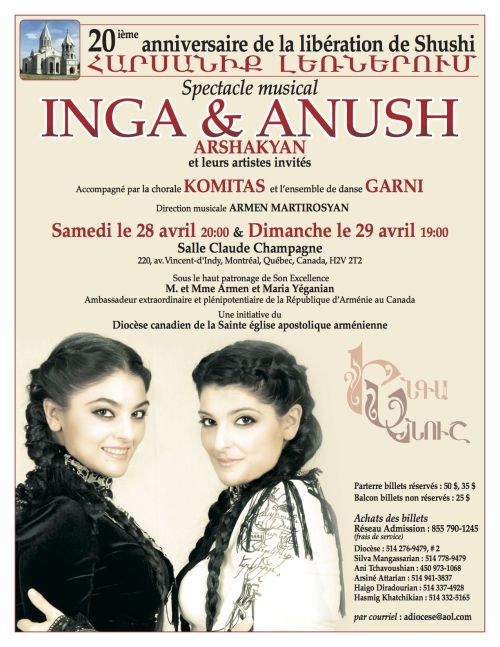 The world renowned singers, sisters, Inga and Anush Arshakyan will perform under the musical director, Mr. Armen Martirosyan. The Komitas Choir of the Montreal Cathedral as well as the Garni Dance Ensemble will participate in this event.