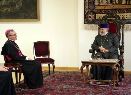 His Holiness greeted the Archbishop and welcomed his new appointment. The Armenian Pontiff expressed satisfaction with the existing brotherly relations and cooperation between the two Churches. His Holiness recalled the visit of Pope John Paul II to Armenia in 2001, on the occasion of the 1,700 Anniversary of Christian Statehood.