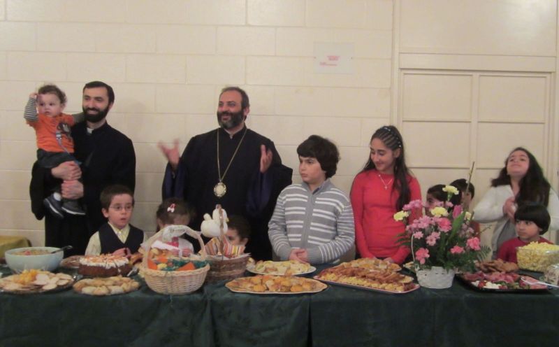 His Eminence Bishop Bagrat Galstanian delivered an inspiring sermon and at the end of the Divine Liturgy and then invited all the children to the altar for their Easter blessing. Following the Divine Liturgy the congregation was invited to a special Easter hospitality reception which was organized by the Ladies Guild of St. Mesrob Church. After the blessing of the table, the children with their parents proceeded with the traditional egg cracking contest.