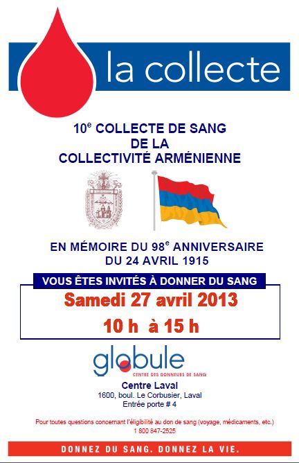 The 10th annual Blood Drive in commemoration of the 98th anniversary of the Armenian Genocide will take place on Saturday, April 27, 2013 at Centre Laval 1600, boul. Le Corbusier, Laval entrance # 4. We urge all those who are able to please participate in this important event.