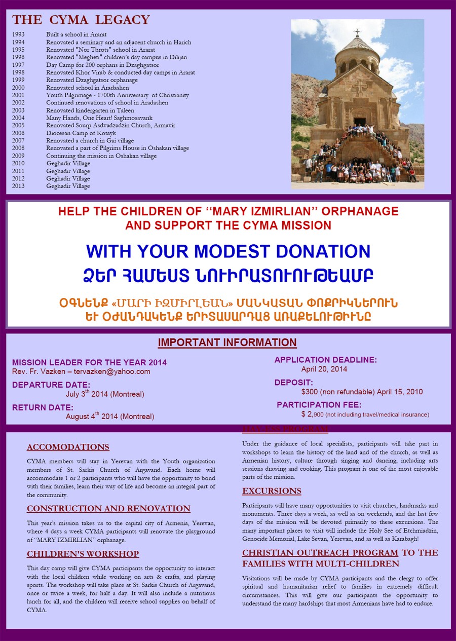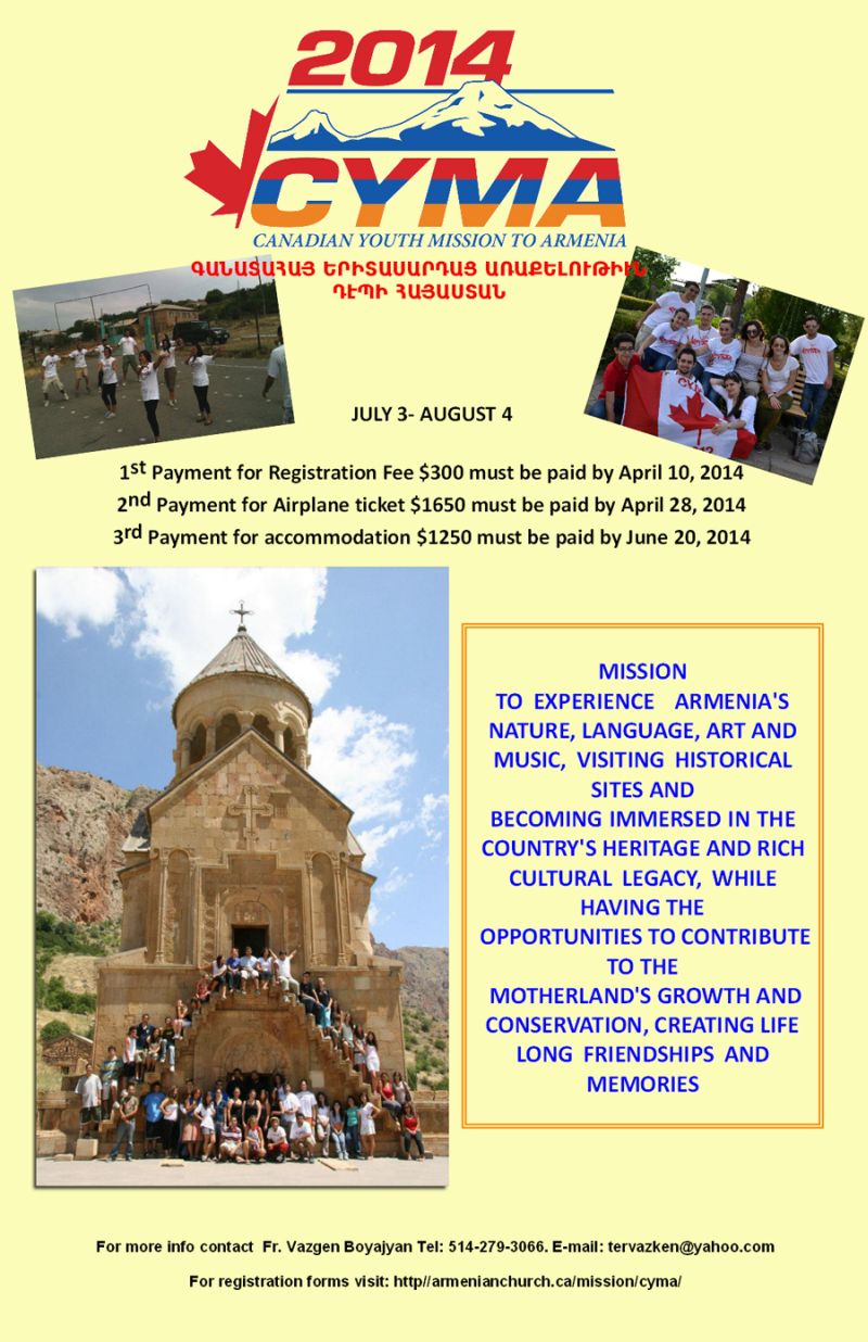 C1The CYMA 2014 mission will take place this summer in Armenia from July 3 through August 4, 2014. For more info please contact Rev. Fr. Vazgen Boyajyan at 514-279-3066 or email tervazken@yahoo.com