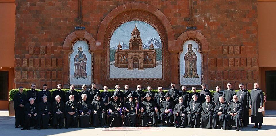 On February 10, clergymen conducted the morning service in the St. Leon Armenian Cathedral followed by the meeting with participation of more than 30 clergymen. The clergy meeting was presided by Primate of the Western Diocese, His Grace Archbishop Hovnan Derderian. During the meeting, Primates of the Western and Canadian dioceses presented detailed reports concerning the respective dioceses. Following the meeting, the Divine Liturgy was celebrated on the occasion of St. Ghevondians feast. The celebrant was His Grace Bishop Abgar Hovakimian, Primate of the Canadian Diocese. During the Liturgy, Primate of the Western Diocese officially welcomed the guests and invited Bishop Abgar to deliver the sermon of the day followed by the Prayers of Pontifical Service (Hairabedagan Maghtank). Following the Divine Liturgy consecration of Cross Stones dedicated to the 100th anniversary of the Armenian Genocide took place.
