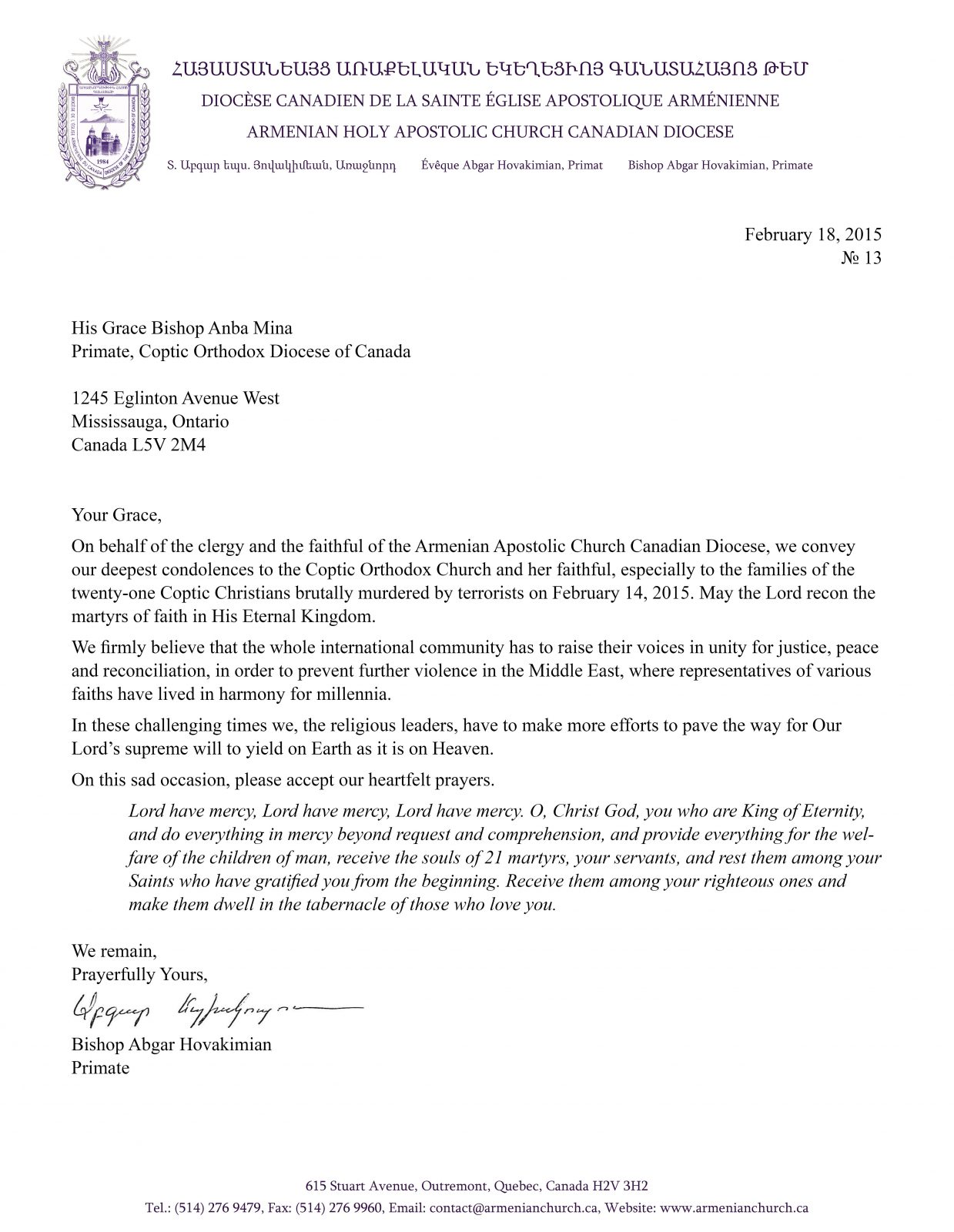On February 18, 2015, His Grace Bishop Abgar Hovakimian, Primate of the Armenian Apostolic Church Canadian Diocese, on behalf of the clergy and the faithful conveyed condolences to His Grace Bishop Anba Mina, Primate of the Coptic Orthodox Diocese of Canada over brutal murder of the twenty-one Coptic Christians by terrorists on February 14, 2015.