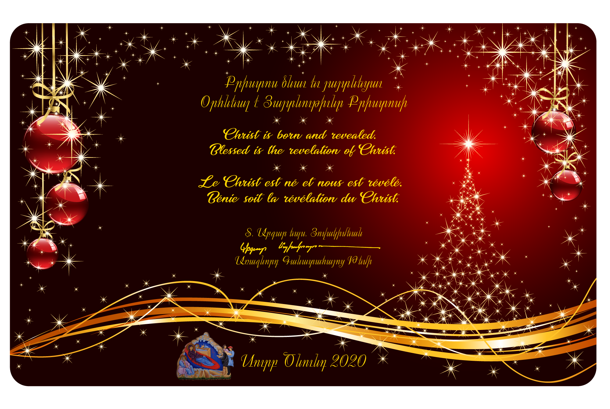 Տիրոջ օրհնութեամբ՝ Նոր Տարուայ ու հրաշափառ Սուրբ Ծննդեան Լոյսի ջահը լուսաւորէ Ձեզ եւ Ձեր ընտանեկան յարկերը։